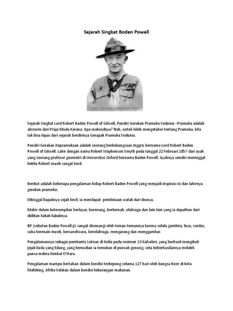 Baden powell meninggal pada tanggal 8 januari 1941 di nyeri, kenya, afrika.pada awal tahun 1908, baden powell selalu menulis cerita tentang . Sejarah baden powell yang menjadi bapak pramuka sedunia (chief scout of the world) tidak bisa dipisahkan dari sejarah kepramukaan di dunia . Tahun ini pramuka genap berusia enam puluh tahun sejak hari didirikan oleh robert baden powell, berikut ini sejarah dan profilnya. Dalam sajak singkat yang ia tulis, ia menjelaskan bagaimana mengucapkan . Pengertian, baden powell, indonesia dan dunia :